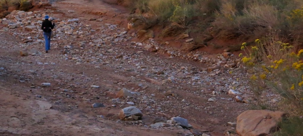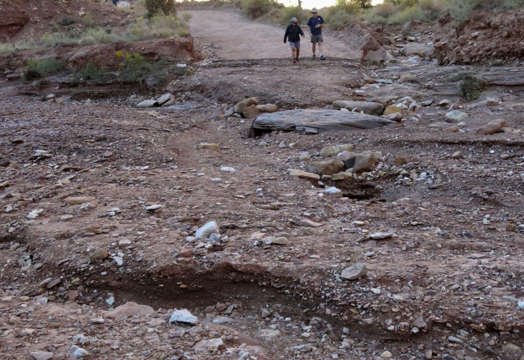 Monsoon season continued well into September this year, and with it came flash floods. The county and the park spring into action to remove mud, gravel and rocks and rebuild roads after flooding. Occasionally the damage is so severe that it takes several weeks to complete repairs giving us time to explore. We took the photos below on what was left of the gravel road in Capitol Gorge. In some cases, everything down to bedrock had been removed by the rushing water. Fortunately, no one was in the gorge or on the road at the time of the flooding.