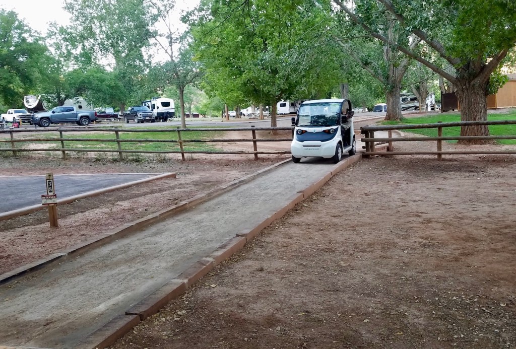 And lest you think it’s all play and no work, here’s a shot of our work vehicle at the most challenging part of our route through the campground. It’s especially fun to drive this path in the dark!